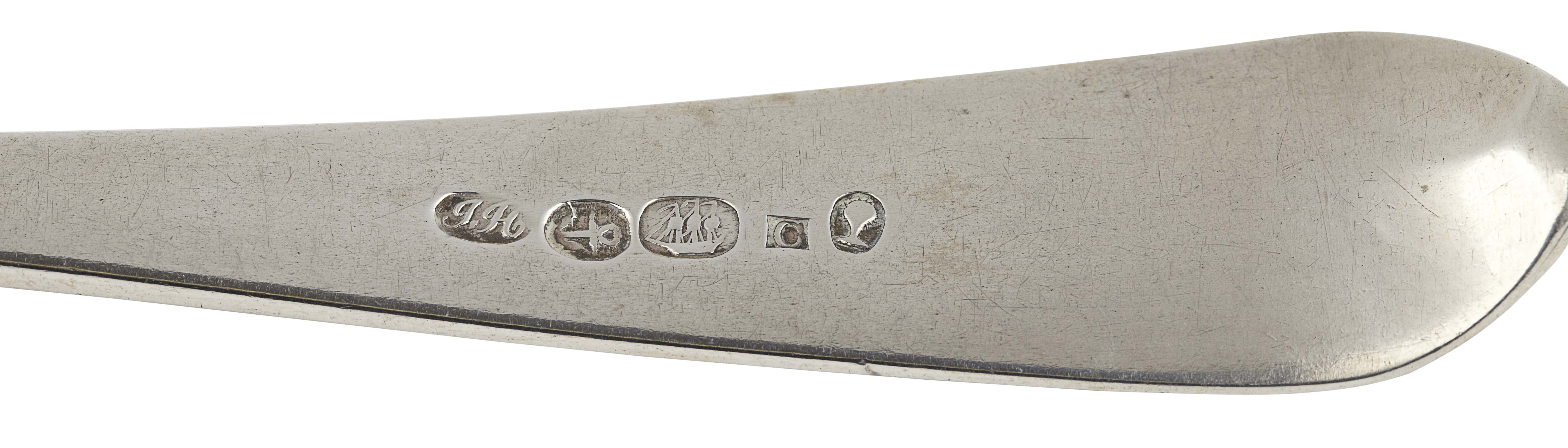 John Heron, marked JH, anchor, ship, C, oak tree, of Old English pattern with engraved initial 'E' to terminal