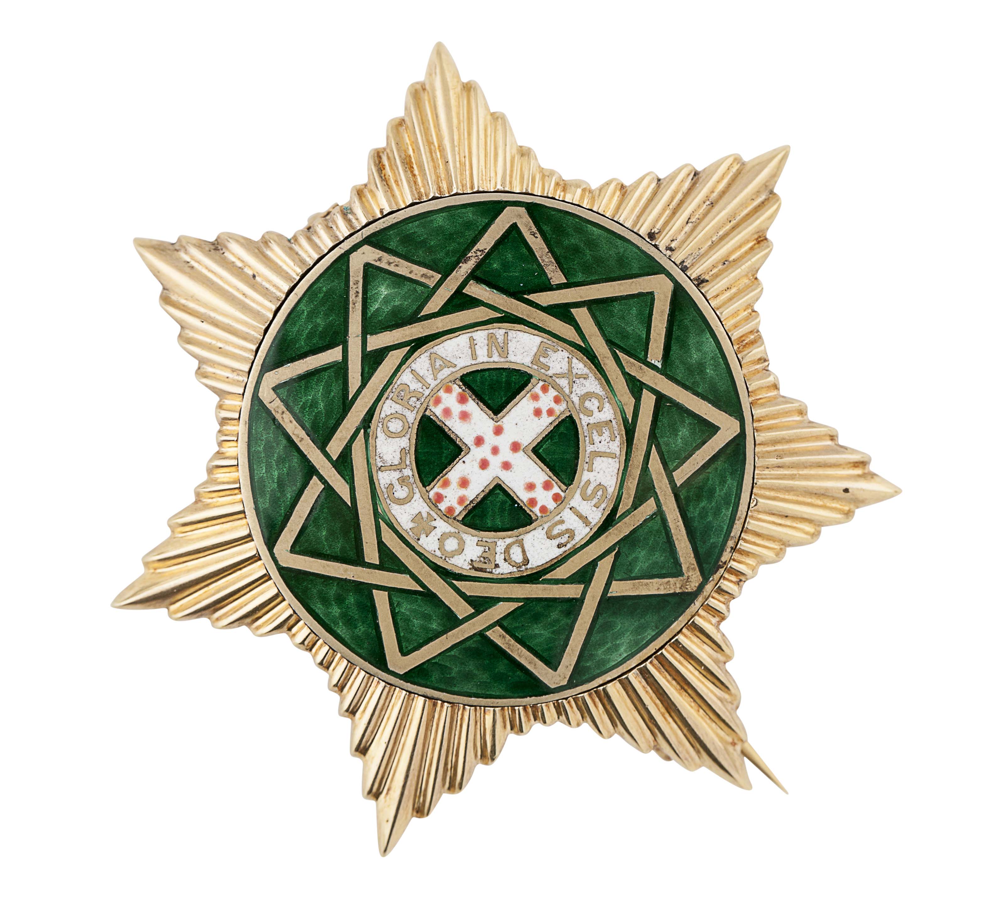 John Hay, marked HAY, of seven pointed star form with fluted decoration, the circular centre with green enamel ground and white detail, inscribed 'Gloria in excelsis deo'