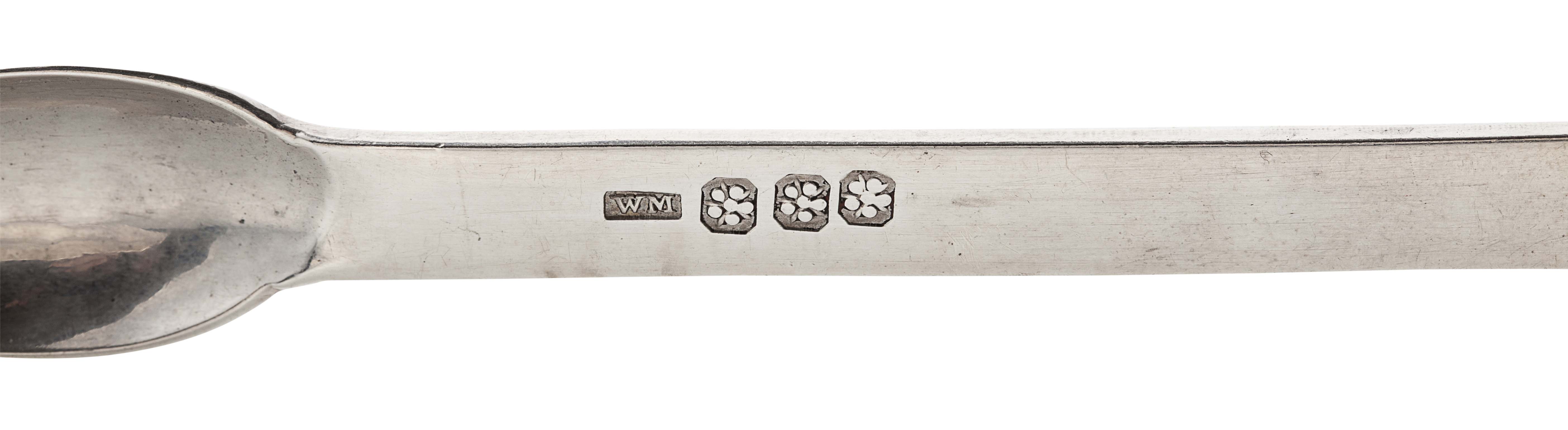 William Mill, marked WM, small rose thrice, of large bowed Fiddle pattern with engraved initials