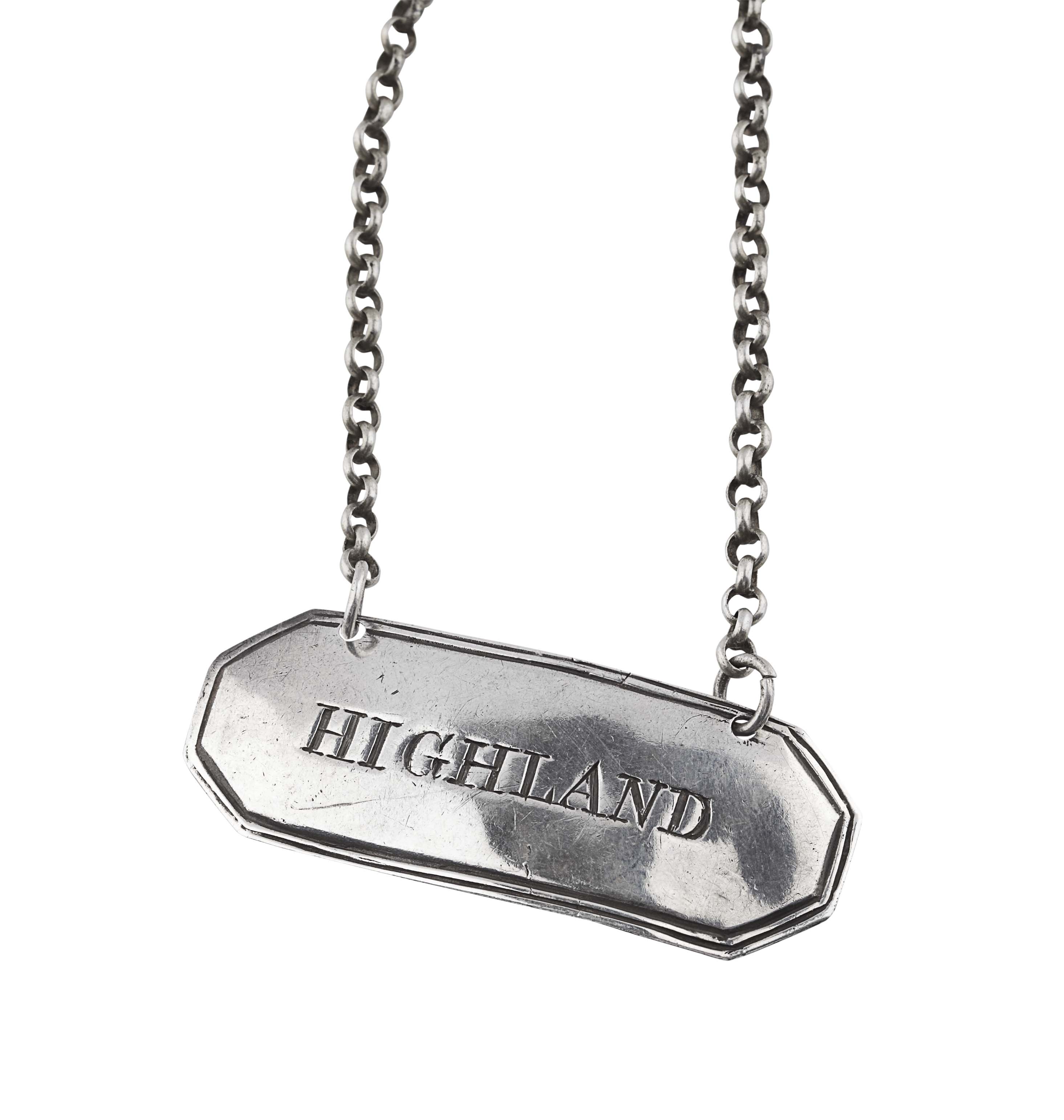 William Ferguson, marked WF, PHD, of canted rectangular form with incised border and inscribed HIGHLAND, with belcher link suspension