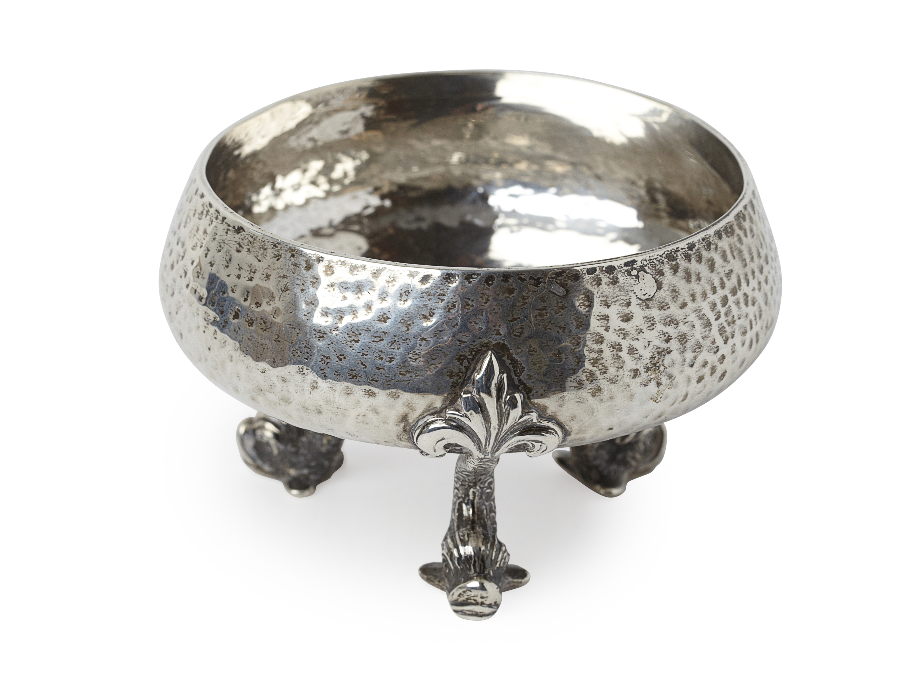 Hamilton & Inches, Edinburgh 1905, the conical planished bowl raised on three cast dolphin supports