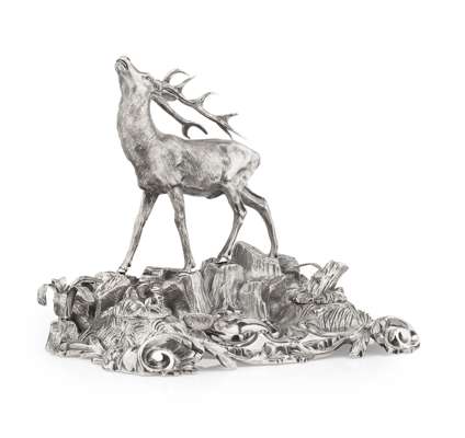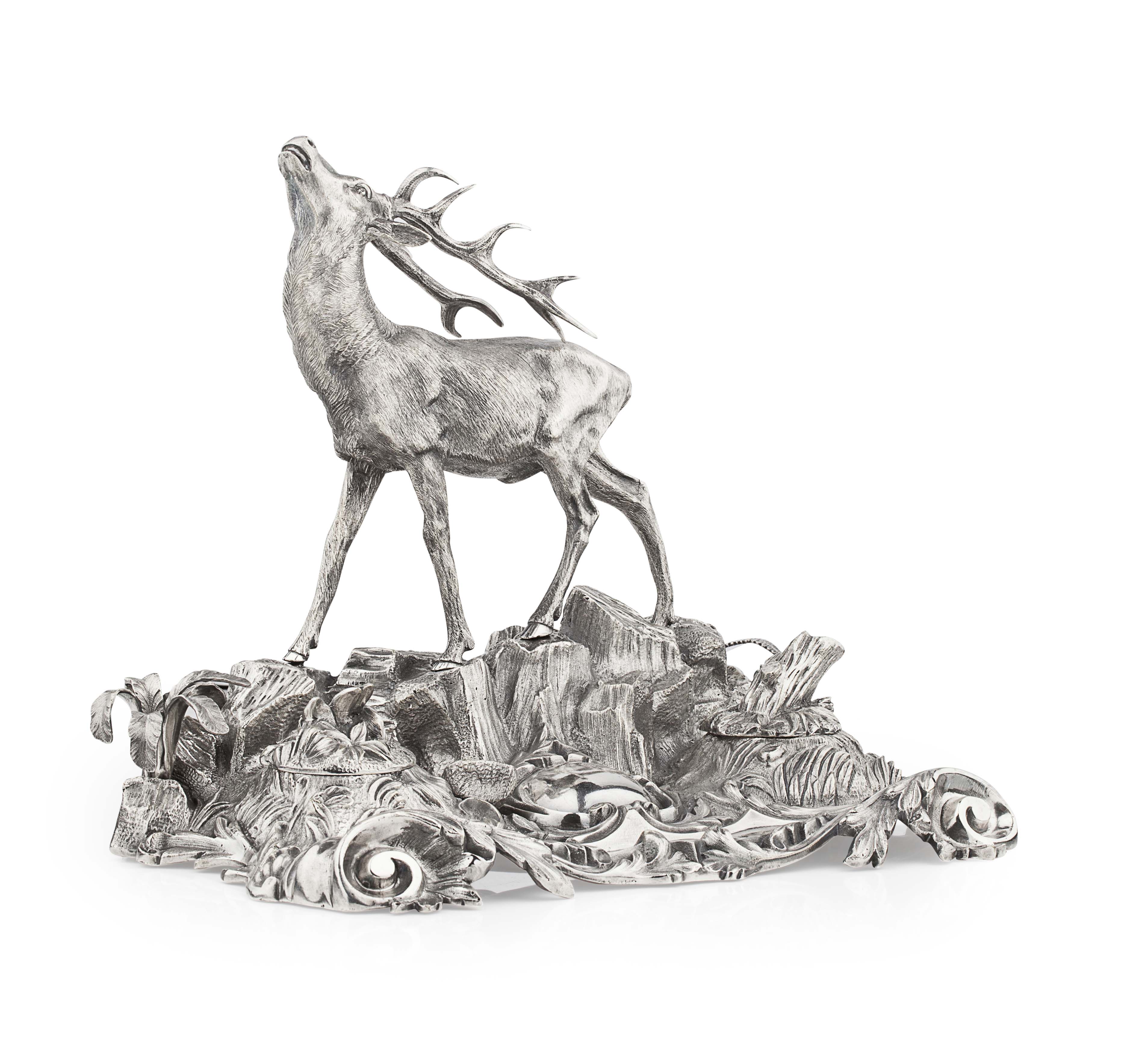 unmarked, naturalistically formed as a standing stag on a rocky and wooded base, with twin inkwells with lift-off covers and glass liners and pen tray to front
