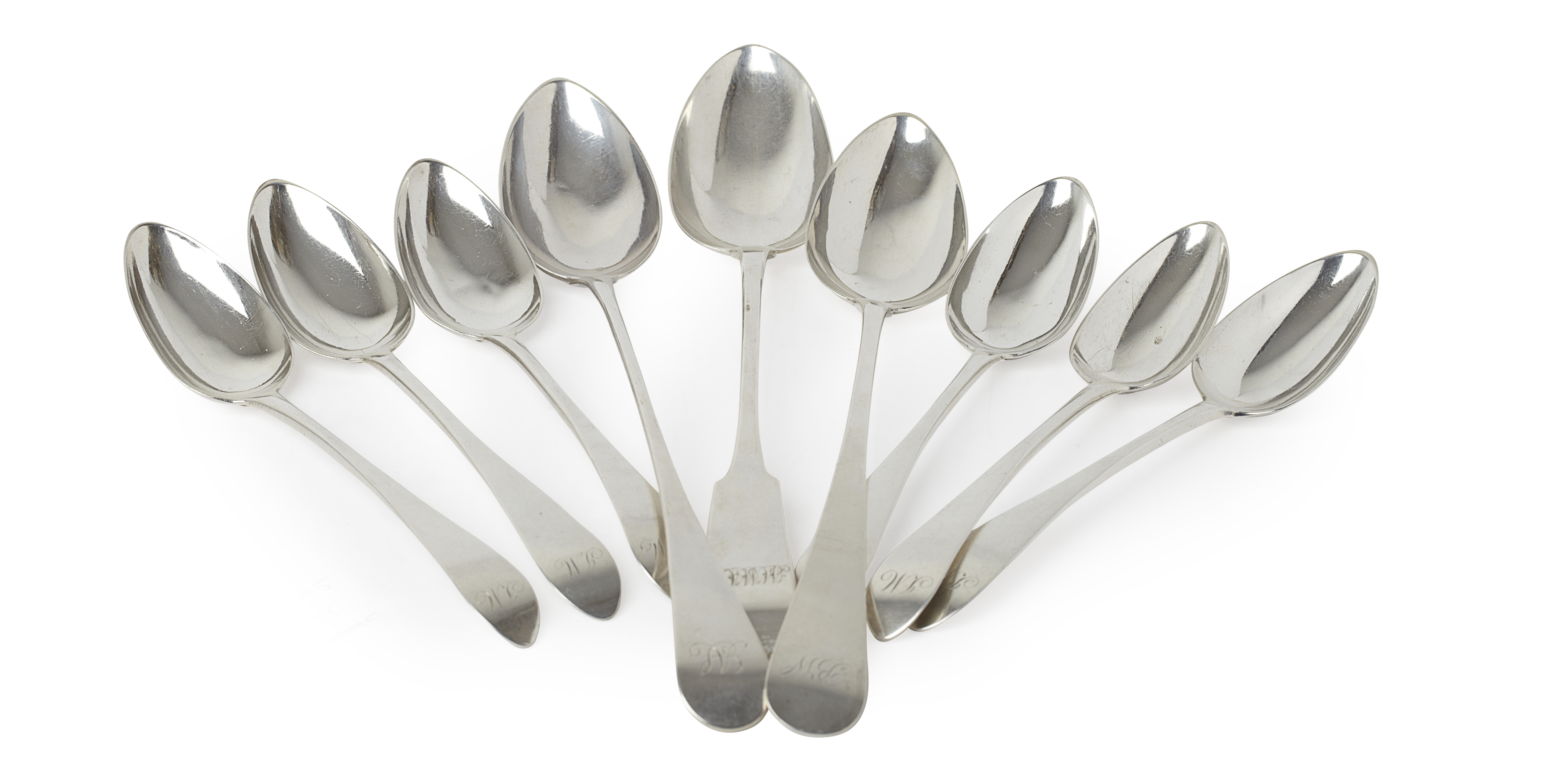 Fraser Howden, Edinburgh 1797 and 1802, of Celtic Point pattern with engraved initial to terminal; together with three Edinburgh George III serving spoons (9)