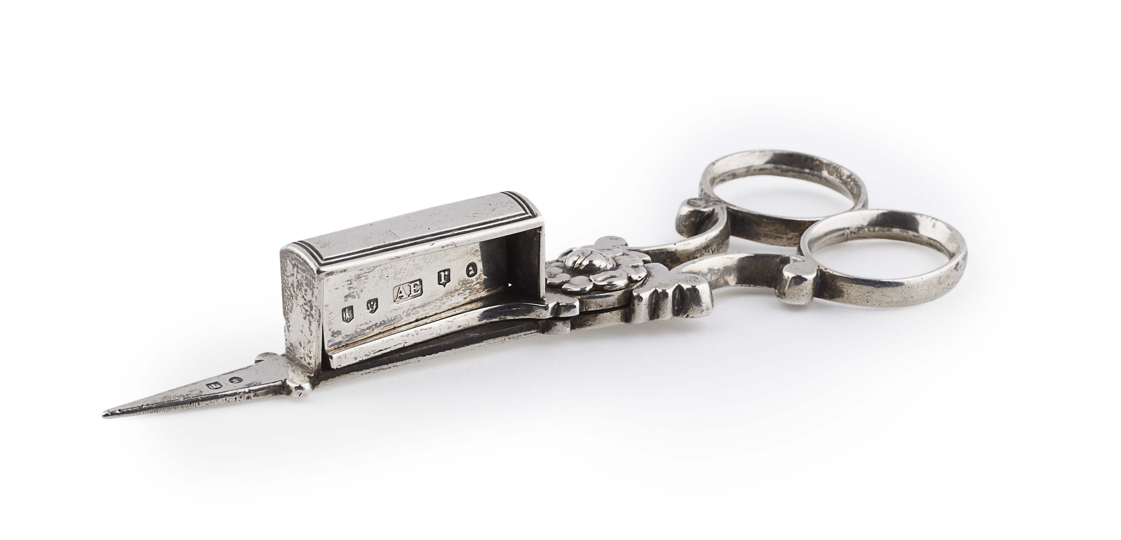 Alexander Edmonstone, Edinburgh 1797, of typical scissor action with foliate detail to hinged section and simple loop handles