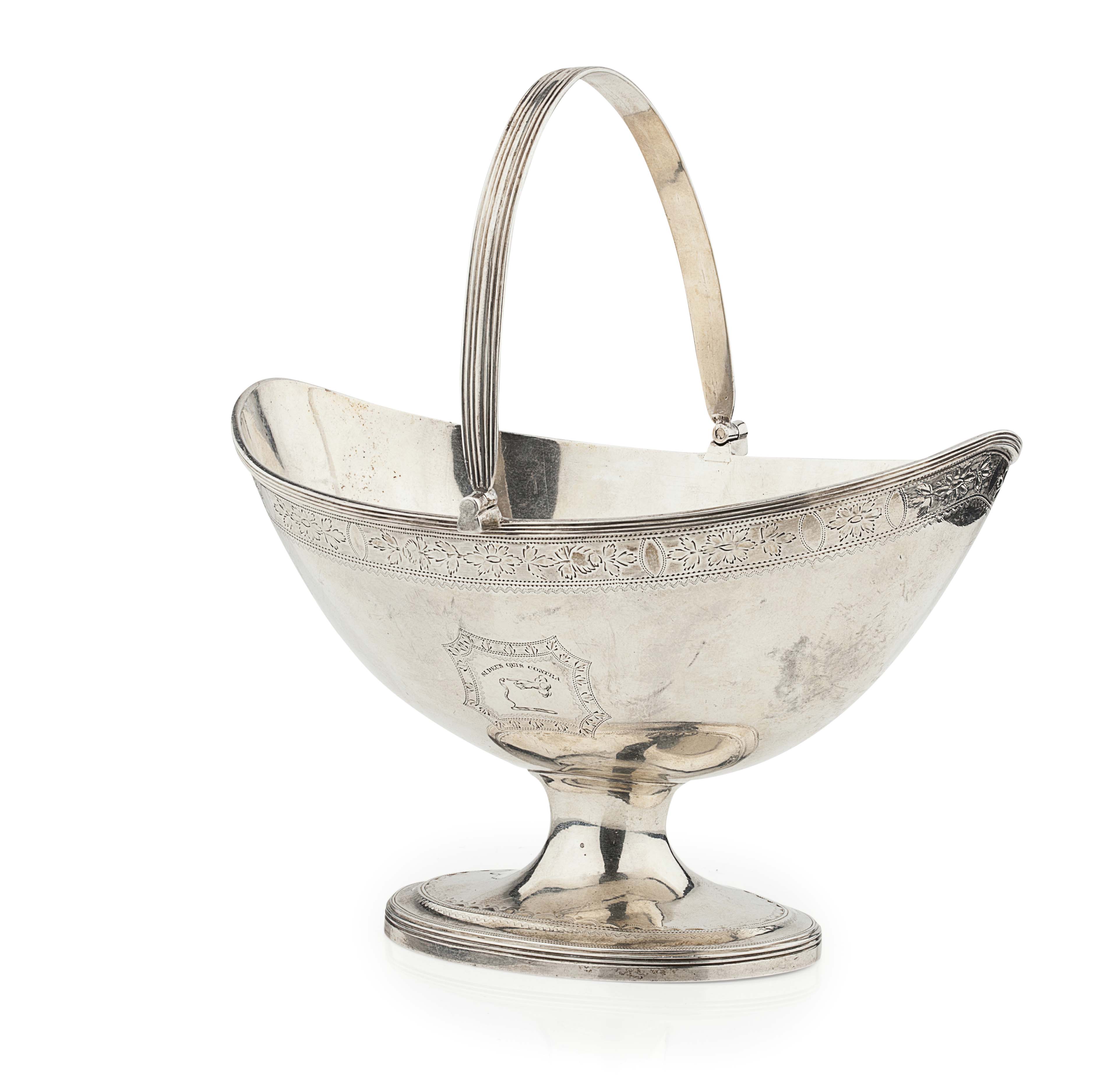 George Beech, Edinburgh 1796, of tapered oval outline, bright engraved border and shaped cartouche, one with engraved crest and motto, reeded swing handle and raised on short stem and spreading oval foot