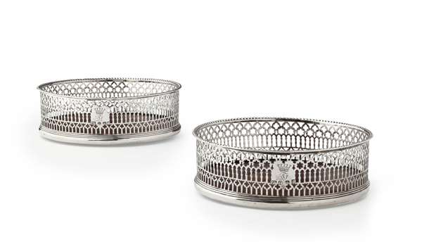 PAtrick Robertson, Edinburgh 1777, the reticulated gallery with cinofoil and arched decoration, with shaped cartouche with engraved initials and coronet, with turned wooden bases (2)