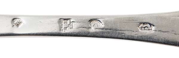Henry Bethune, Edinburgh 1704, Assay Master James Penman, of wide dog-nose pattern with engraved crest to reverse of terminal, with three prongs
