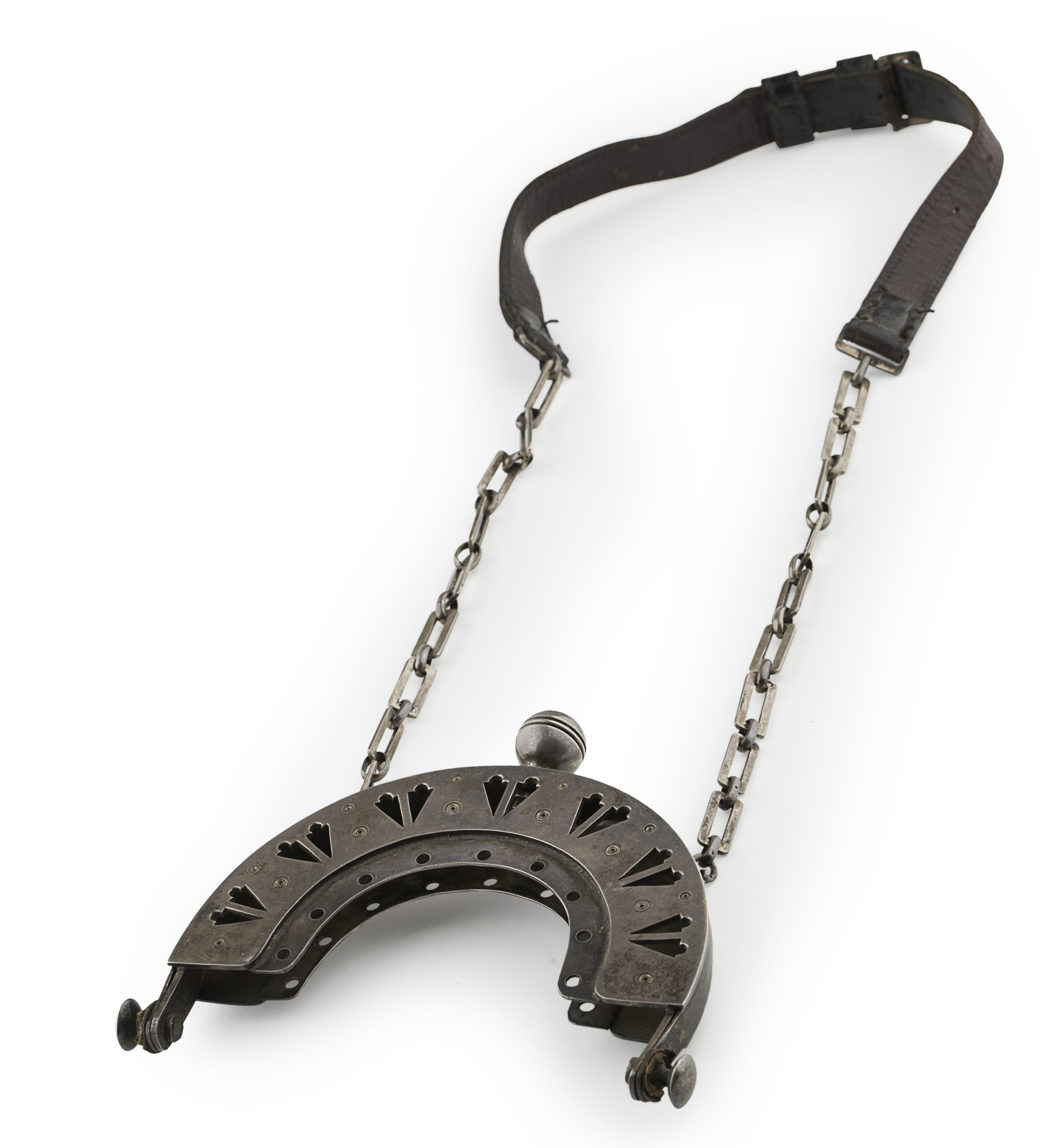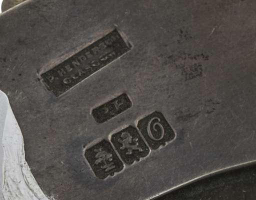 P Henderson, Glasgow 1911, the hinged arched frame with pierced stylised hearts and ring and dot decoration, with long link sporran chain (unmarked)