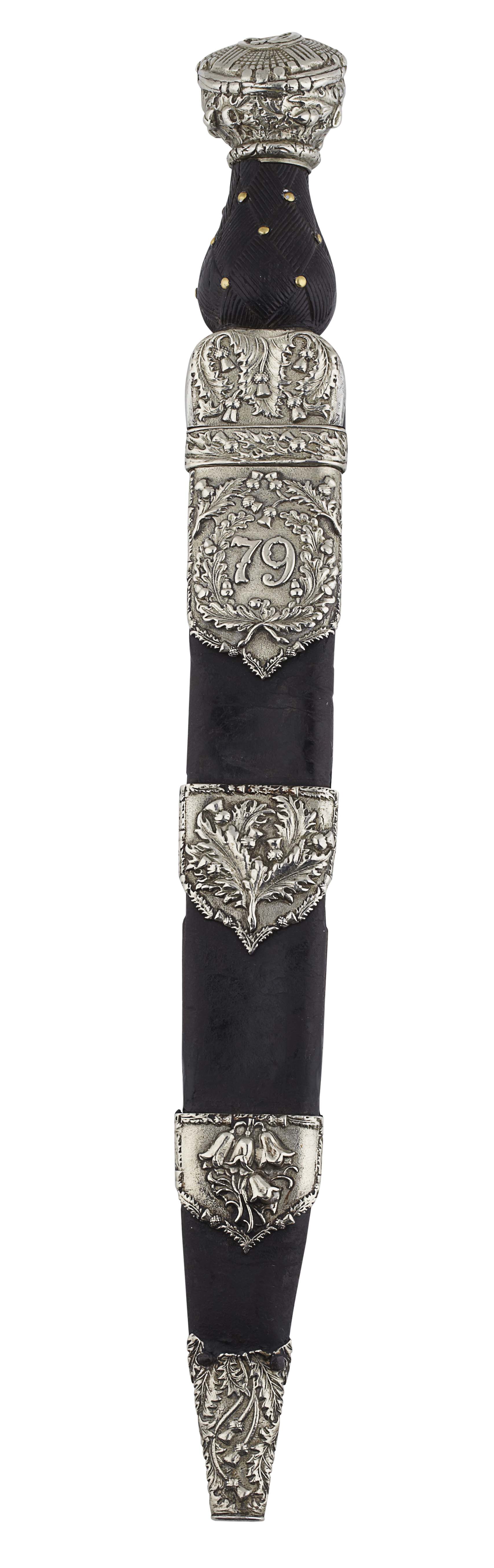 the cast silver plated mounts signed R & MB Kirkwood Edinburgh, the sheath locket mount inscribed with 79 (for The Queen's Own Cameron Highlanders) within a trophy of stylised thistles, with a hardwood grip carved with interlace and a silver stud at each cross terminal, the pommel with 79 in high relief, a single edge fullered blade