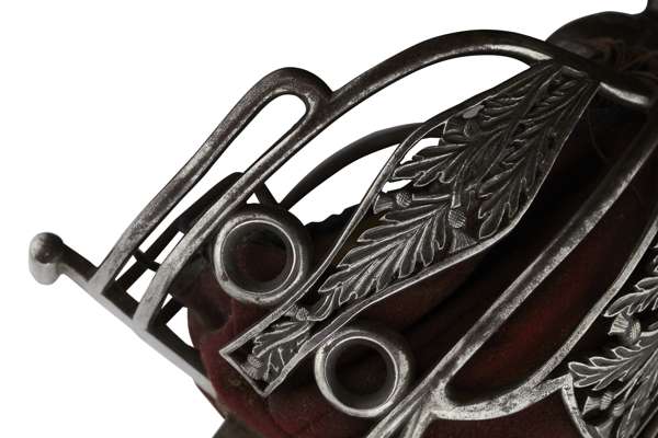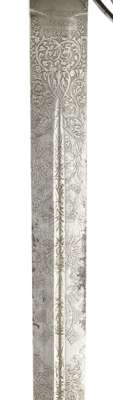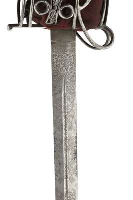 the hilt of round section bars intersected with panels of cast stylised thistles on the side guards, the forward guard a plain panel, with a small wrist guard, fishskin grip bound with a double twist of silver wire with buff leather liner backed with crimson felt with red fringe, the blade etched with VR cypher surmounted with the Royal Crown, with the star of the Order of the Thistle and blade maker's name E SABELL BIRMINGHAM at the ricasso, missing scabbard