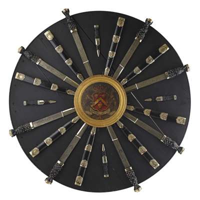 the eight modern military dirks displayed with scabbards beside, interspersed by four matching sgian dubhs, all displayed around a 19th century coaching panel with painted armorial
