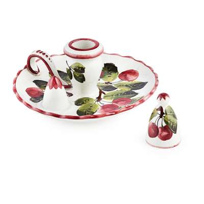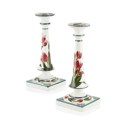 A MATCHED PAIR OF WEMYSS WARE TALL SQUARE BASE CANDLESTICKS