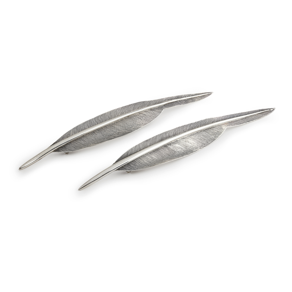 marked F&M, camel, INVS, each feather naturalistically formed with fine engraved detail, hinged pin to reverse (2)