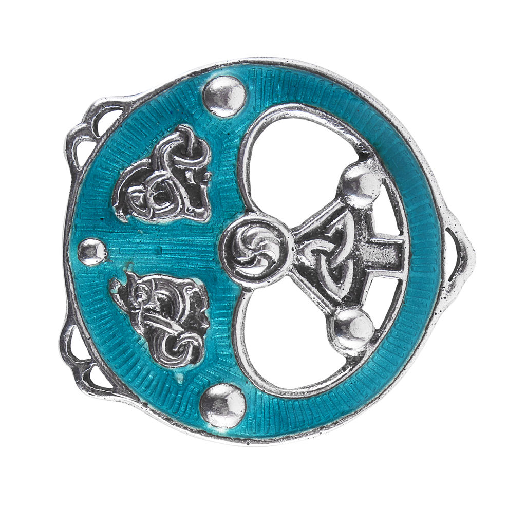 marked AR, IONA, of shaped circular outline with turquoise enamel around plain bosses and Celtic knot works and beast panels