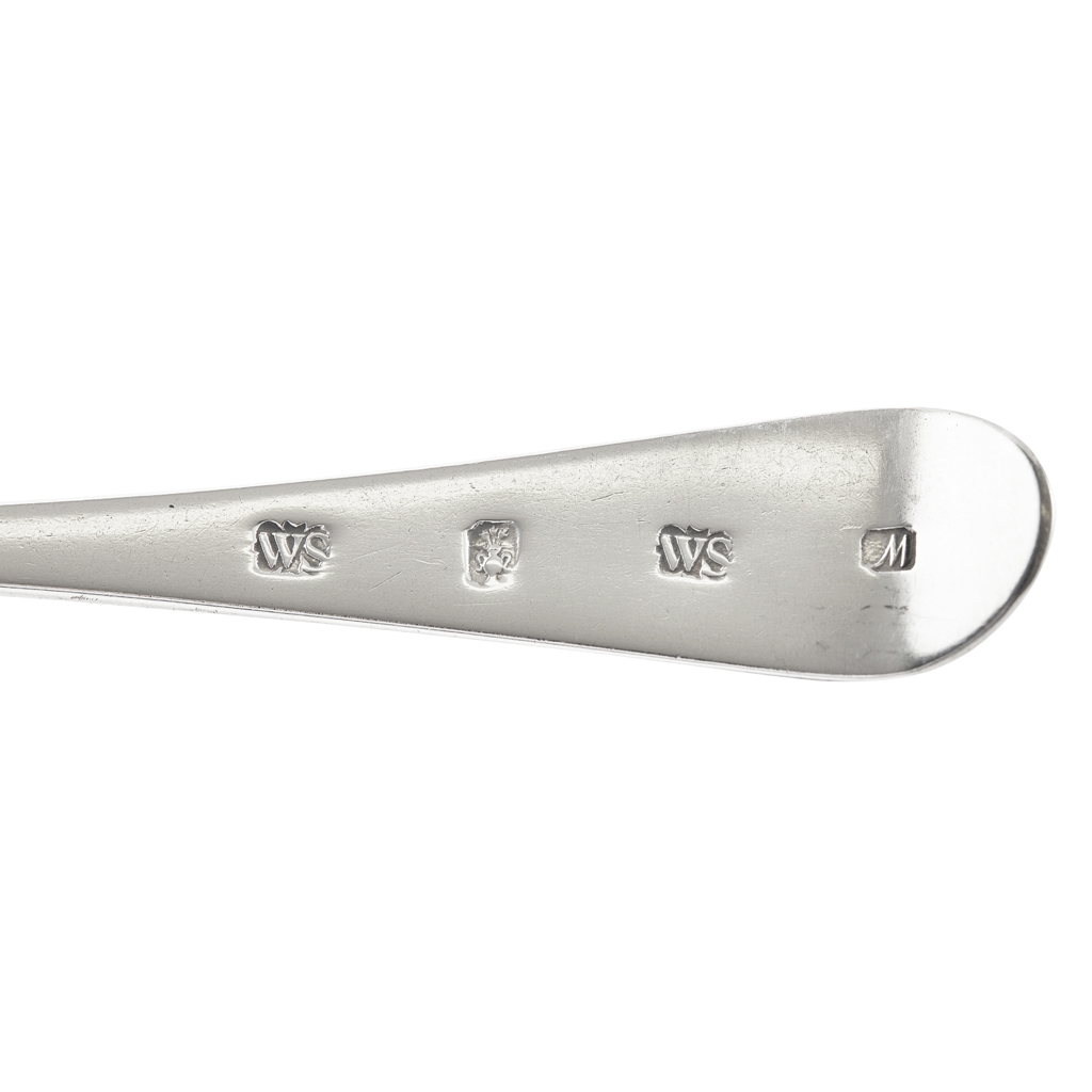 marked WS, pot of lilies, WS, M, of Old English pattern with feathered edges, twin crest and motto (6)
