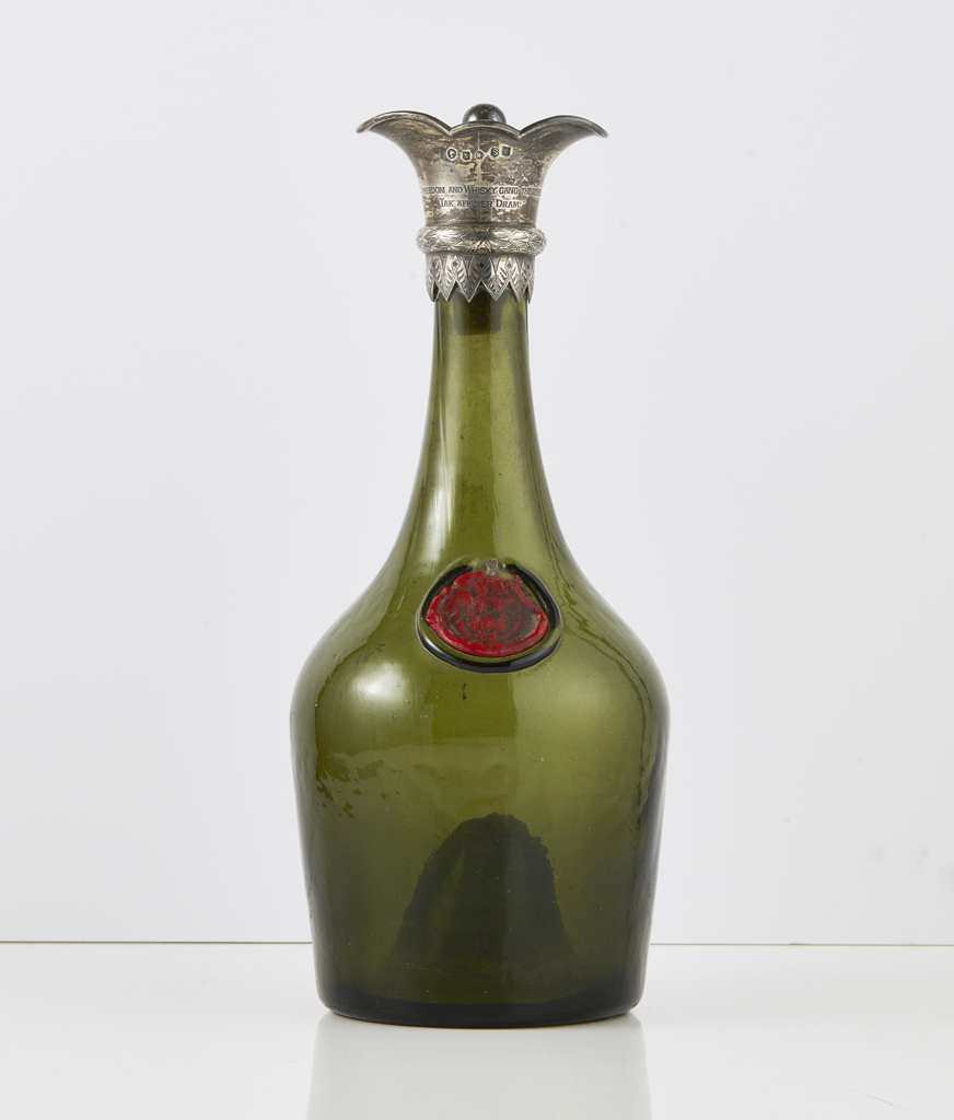 A VICTORIAN SILVER MOUNTED 18TH CENTURY WHISKY BOTTLE / DECANTER