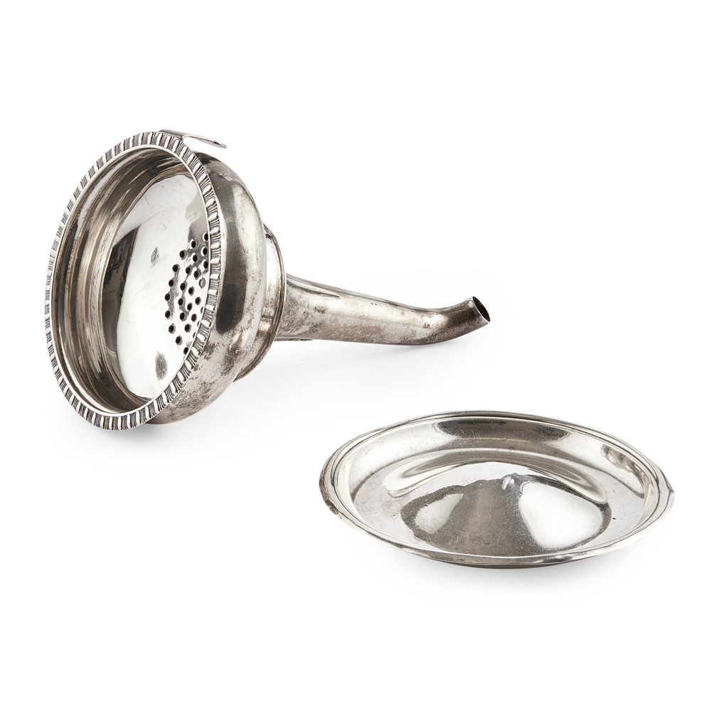 date letter lacking, of conventional form with baluster bowl and gadrooned rim, pull-off curved spout; together with a matched wine funnel stand of simple domed dished form, J Zeigler Edinburgh, circa 1800 (2)