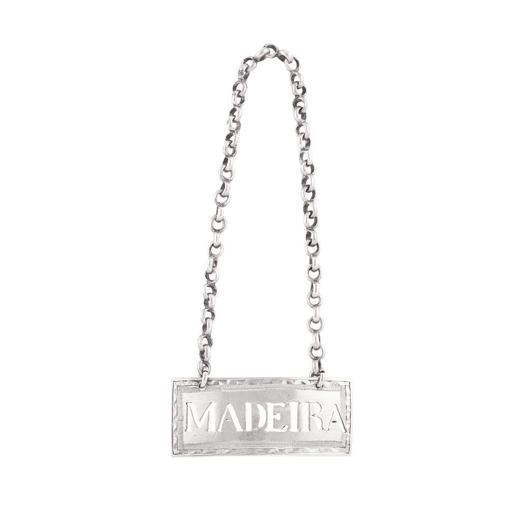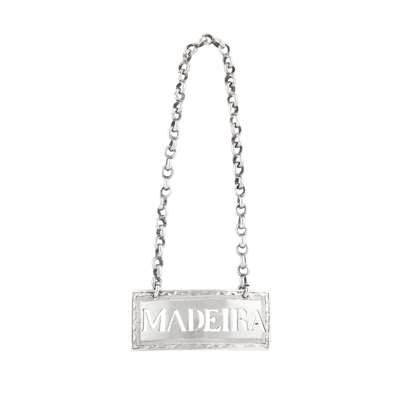 marked IG, ABD, of rectangular form with bright engraved border and pierced MADEIRA, belcher link suspension