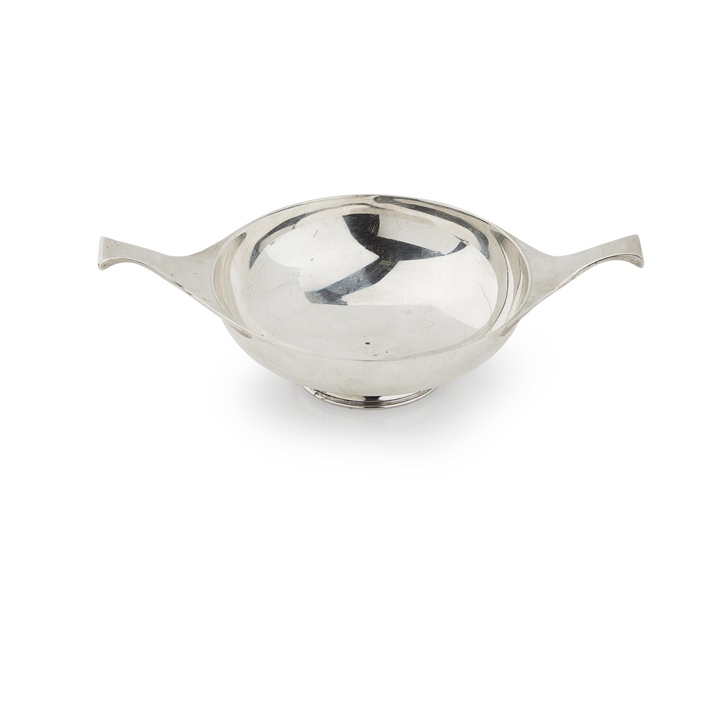 marked ROBB / BALLATER in triangular punch, the shallow hemispherical bowl with twin shaped lugs and raised on simple collet foot