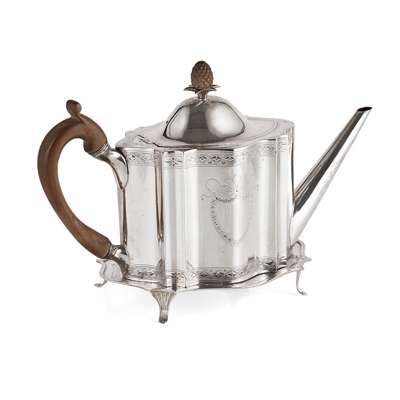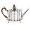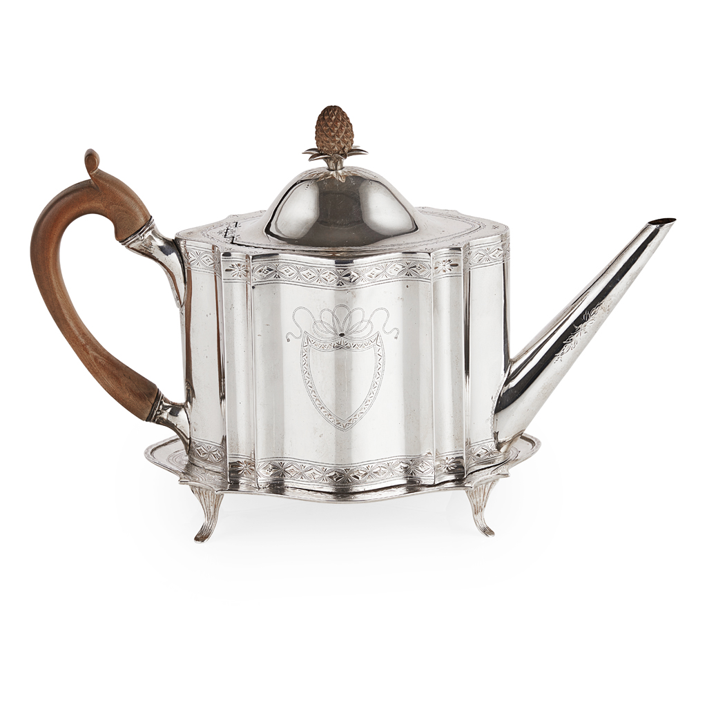 of fluted straight sided form, bright engraved borders and classical cartouche, C scroll wooden handle and tapered straight spout, the hinged domed cover with carved wooden pineapple finial; together with a matching teapot stand raised on four fluted bracket supports (2)