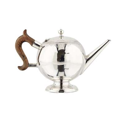 Assay Master Archibald Ure, of plain bullet form, the tapered straight spout with finely chased foliate scroll and shell border to rim and cover, the domed hinged cover with ball finial and moulded cast hinge, simple S scroll fruit wood handle, raised on a spool foot with initials M / SF to underside