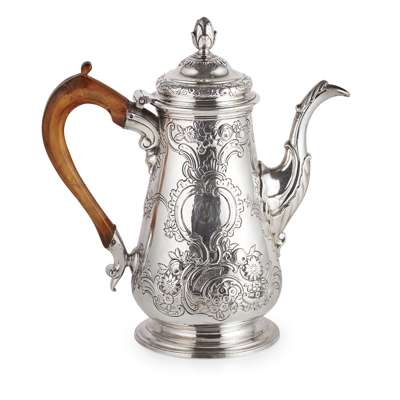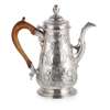 the baluster body with chased rococo scrolls, foliage and flower heads, shell and scroll formed cartouches with initials, leaf capped S scroll spout and fruit wood handle, the domed hinged cover with bud finial