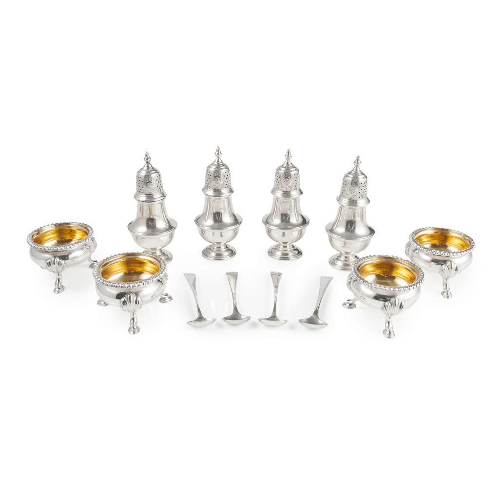 comprising four cauldron salts with gadrooned rims and raised on foliate and hoof feet, Glasgow 1894; four baluster pepperettes with pierced and engraved domed cover, Glasgow 1928; and four matched old English pattern salt spoons, various dates (12)