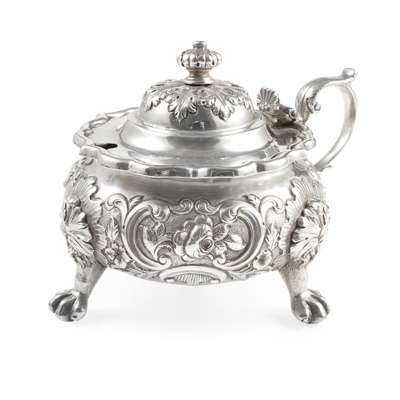the baluster body with embossed floral and foliate decoration, with scroll formed cartouche with engraved crest, the cast handle with hinged cover and acanthus decoration, raised on three acanthus and paw feet