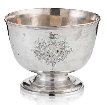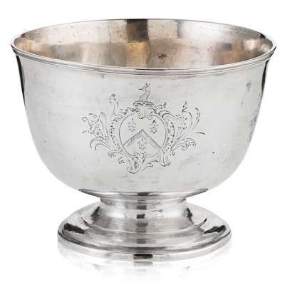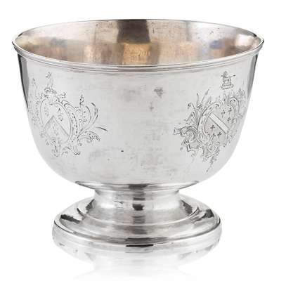 marked twice, maker's mark only in serrated punch, of plain form, slight moulded border, engraved two armorials, all on a simple spreading foot