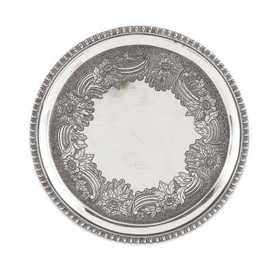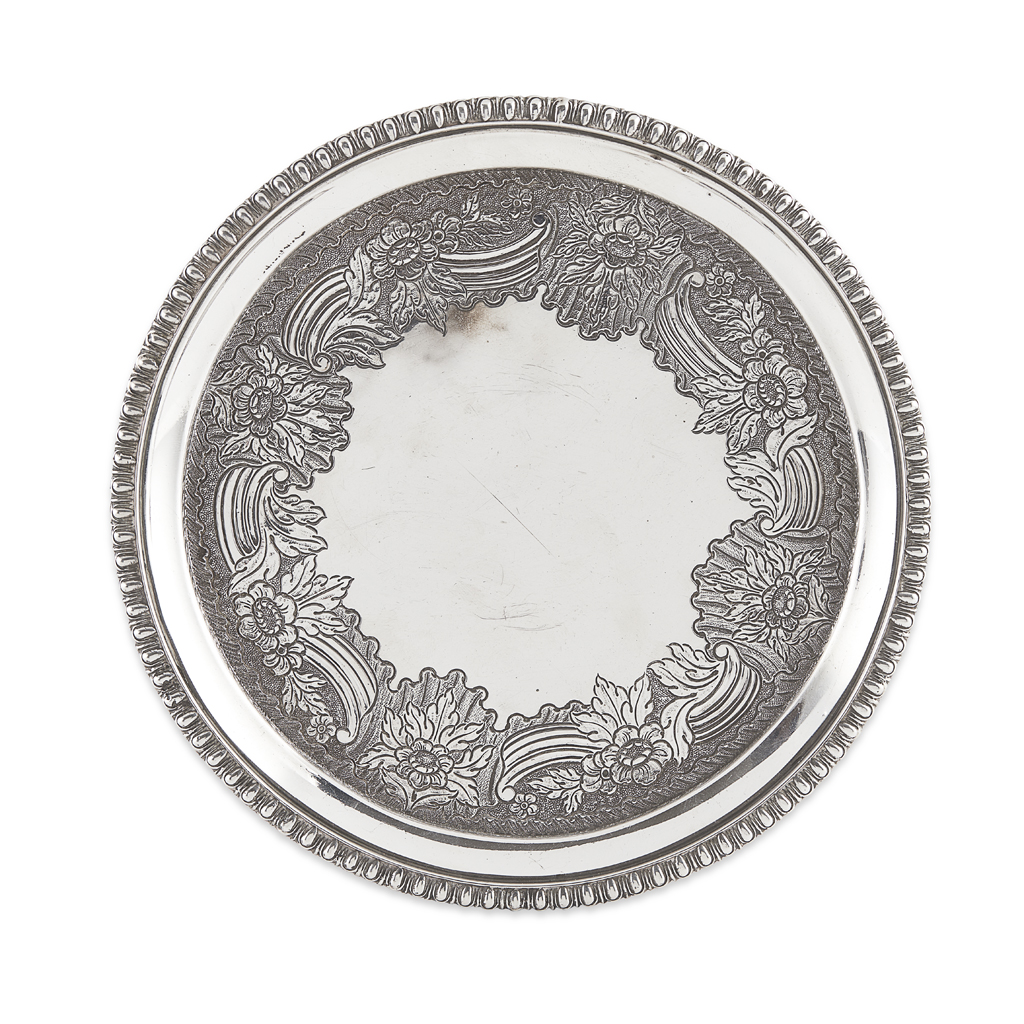 of circular outline with gadrooned rim, the inner border of chased flower head and scrolls, raised on three cast Neoclassical paw, acanthus and scroll supports