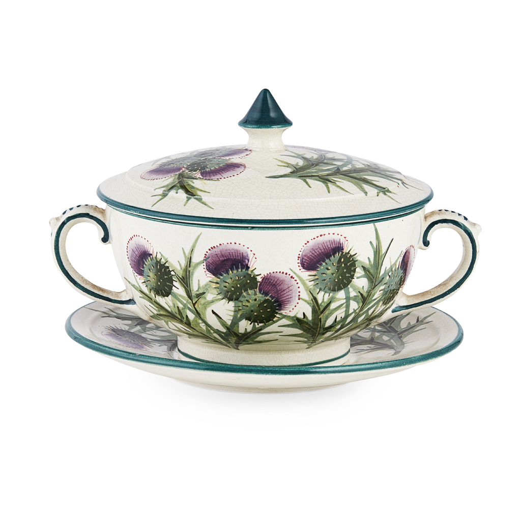 A WEMYSS WARE TWIN-HANDLED BOWL, COVER AND STAND