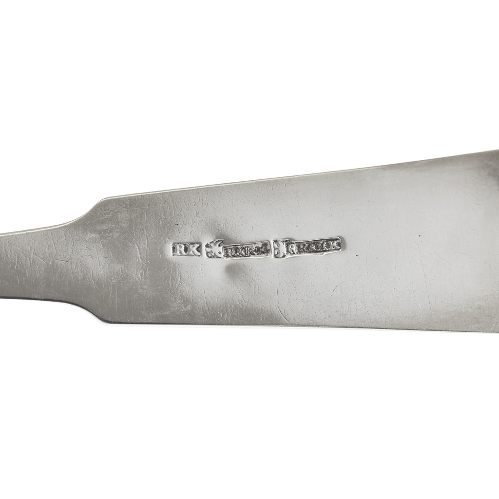 marked RK, eagle, R&RK, eagle, R&RK, of Fiddle pattern, script engraving 'To Mrs G B ' to terminal