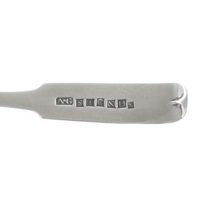 Items of Stonehaven silver that can be confidently ascribed are extremely rare, with four items known to survive. Other items with similar 'A.G.' makers marks and two part stylised thistle/ flower punch have previously been tentatively attributed to Glenny in Stonehaven but are still not definitely ascribed. Without further evidence it seems unlikely this attribution can be proven correct. Only items with this combination of marks should be considered of definite Stonehaven manufacture as previously stated these are extremely scarce and must be considered among the rarest of all Scottish provincial town marks, the only possible rival being Ellon, which at present has slightly fewer pieces recorded.