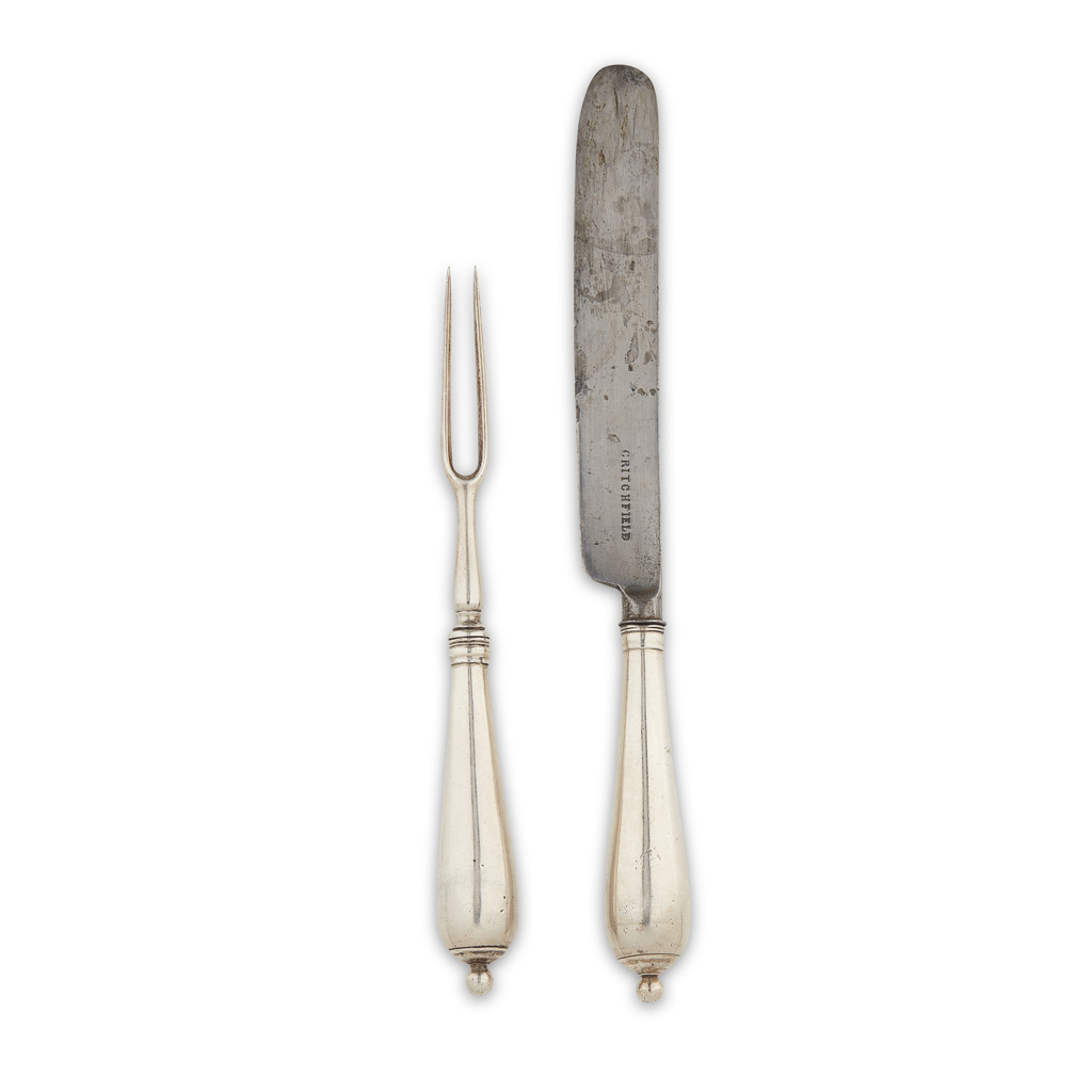 indistinctly marked, with bulbous tubular handles with bead finial, the fork with two slender tines, the steel knife blade marked CHRICHFIELD (2)