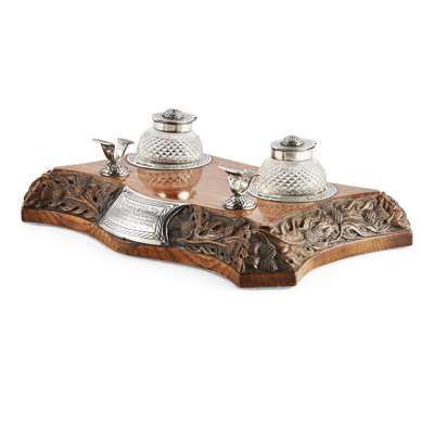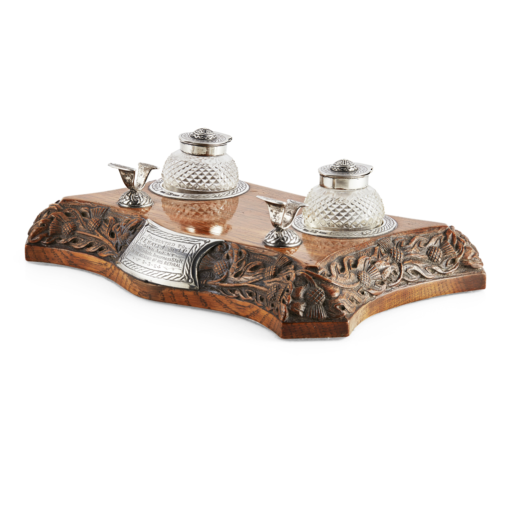 marked FF&M, camel, INVSS (marked twice to stand and both ink bottles), the shaped rectangular oak base carved with a border of trailing thistle head and foliage, set with a presentation plaque to front, inscribed 'Presented to F.E.Watt Esq J.P Bank Agent by his Eastgate Inverness staff in the occasion of his retiral 3-3-24', the base set with Celtic knot work pen rest and inkwell mounts with cut crystal ink bottles with engraved hinged covers