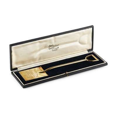 of conventional form as a miniature spade, engraved to reverse of blade with full armorial, the front engraved 'Burgh of Milgavnie Housing Scheme, presented by the Architects, Measures & Contractor to Provost Ferguson on the occasion of his cutting the first sod 13th NOVr 1920', in original fitted case