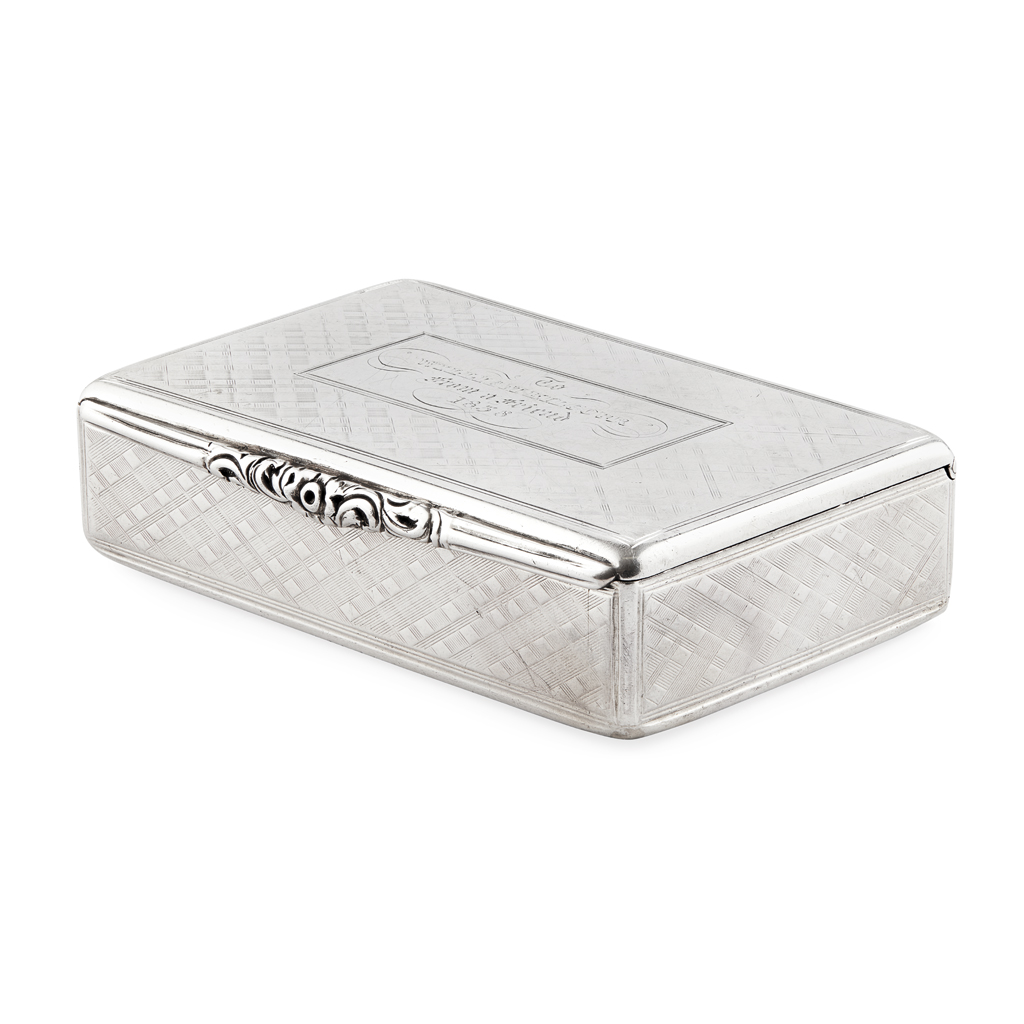 the rectangular box with all over cross hatched engraved decoration, the hinged cover with presentation cartouche engraved 'To William Kilgour from a friend 1838' with cast floral thumb piece