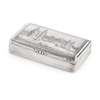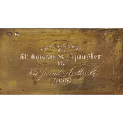 the rectangular box with simple reeded sides and engine decoration base, the hinged cover with an engraved scene of the Palace of Holyrood with figures in the fore ground, engraved bottom right ‘M.E.Pitcherski’, the interior of gilded cover engraved ‘Presented to Mr Gustahes Spindler by His Friend JMM 1833’