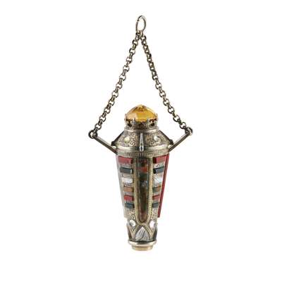 makers mark only to base, the tapered silver gilt vase body with multi-coloured agates and hardstone set within engraved borders, the hinged domed cover with foliate scrolls and cabochons set within surmounted by a claw set citrine, the whole suspended by belcher link chain, in original fitted case