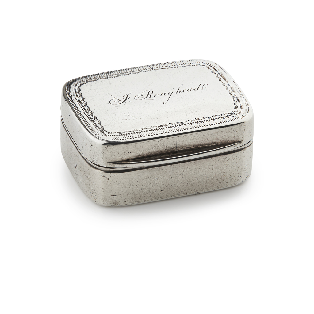 marked WL, maker's mark only, of simple rectangular form with fine wriggle work border to lid, the centre engraved in contemporary script 'J Roughead', the gilt interior with hinged grill engraved and pierced with thistle decoration