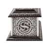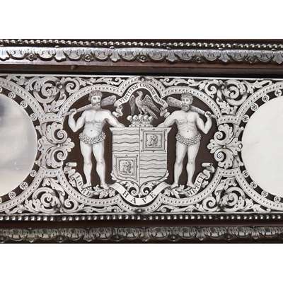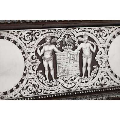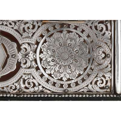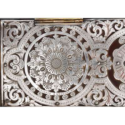 the finely engraved decoration and armorial to this piece follow regular themes used by MacGregor in his designs, with fine interlace and patterns and a skilled hand to armorials and lettering. It is obvious from Macgregor's other commissions, including card cases featuring Gainsborough portraits, Royal portraits and scenes of the Breadalbane estate, that his inspiration is not only artistic but was a skilled interpreter of known patterns.