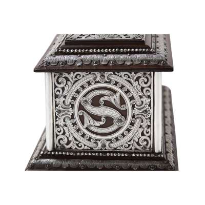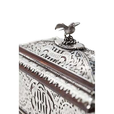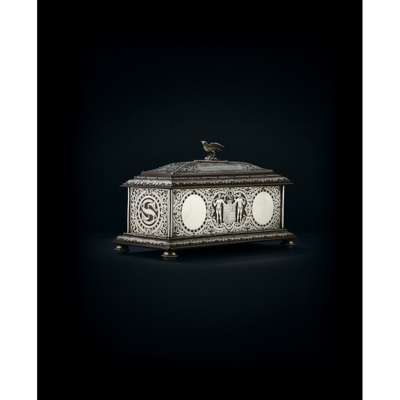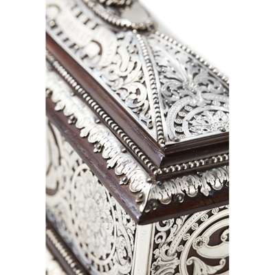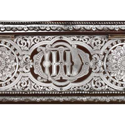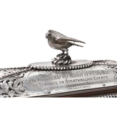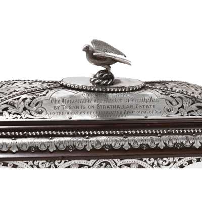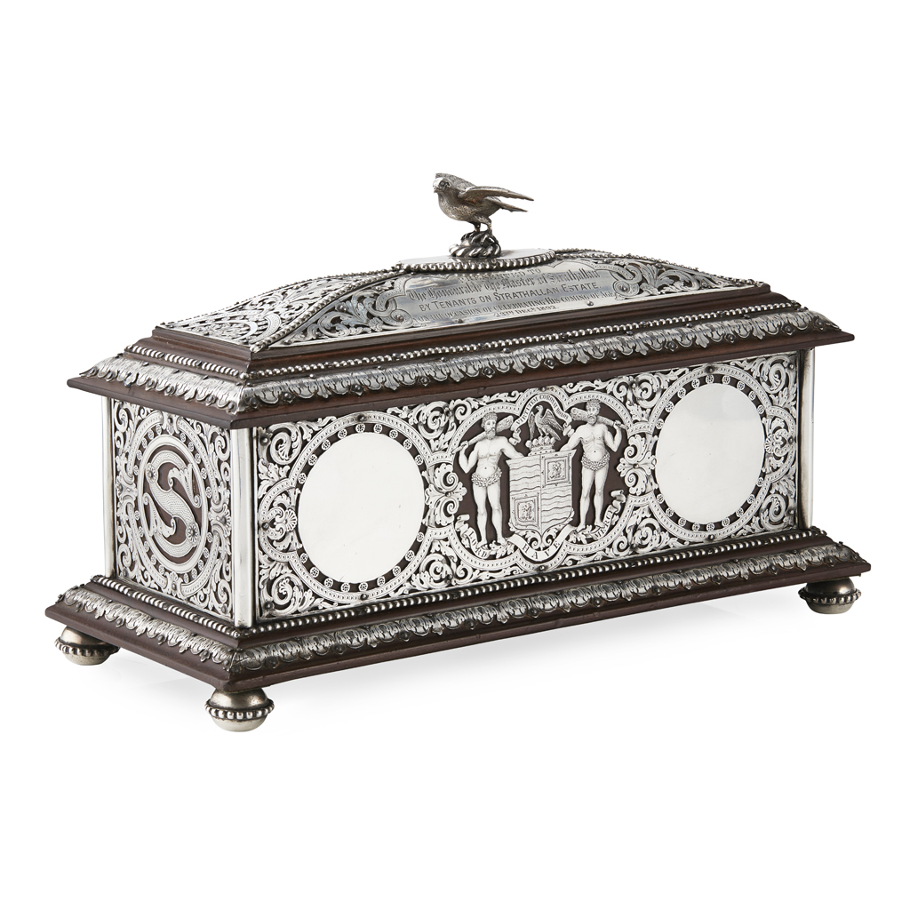 inscribed 'Designed and wrought by David MacGregor, Perth', the rectangular oak casket with applied silver panels and borders each profusely pierced and engraved with acanthus border and fine foliate and scroll interlace panels, the front panel with full armorial, the cover with cast heraldic eagle, the presentation panel inscribed 'Presented to The Honourable The Master of Strathallan by Tenants on Strathallan Estate on occasion of celebrating his coming of age 29th December 1892'