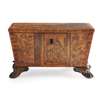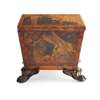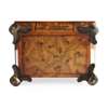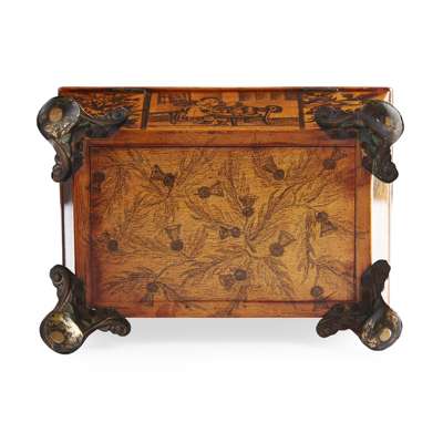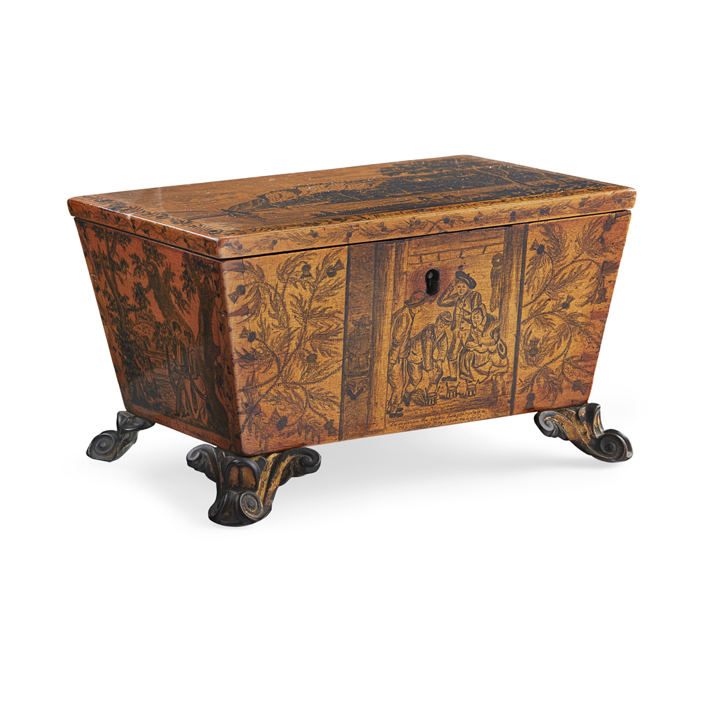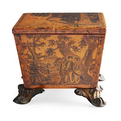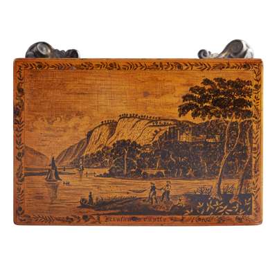 of rectangular form, the hinged cover decorated with a penwork view of Kinfauns Castle from the loch's edge, the tapering sides also decorated; the front with a panel of thistles flanking an interior scene with figures and two lines from Robert Burns' Halloween "In order on the clean hearth-stane, The luggies three are ranged"; the right side decorated with a view of a Highlander outside a cave and two lines from Robert Burns' Strathallan's Lament "Thickest night o'erhang my dwelling, Howling tempests o'er me rave"; the left side decorated with a couple in a rural setting and with line by Bernardin de St Pierre - Studies of nature "To repeat the lessons of it, to the fair one whom he loves"; the rear with a panel of thistles flanking an interior view of an old couple and two lines from Robert Burns' Scotch Drink "His wee drap parritch, or his bread, Thou kitchens fine", all raised on gilt feet, velvet lined interior