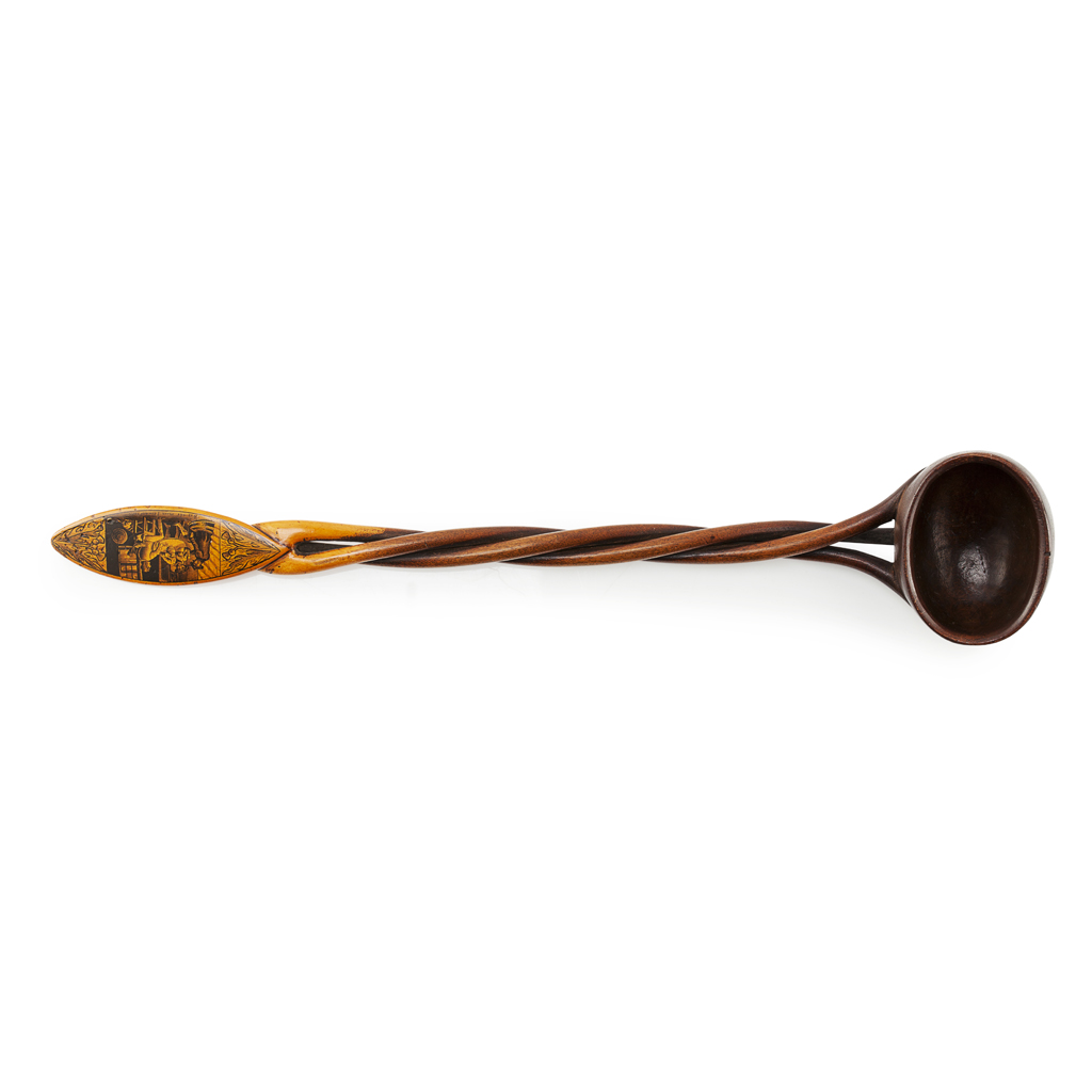 with a wrythen handle and pointed oval terminal decorated with a penwork scene of three men drinking in an inn and the inscription 'It is the moon, I ken her horn'
