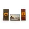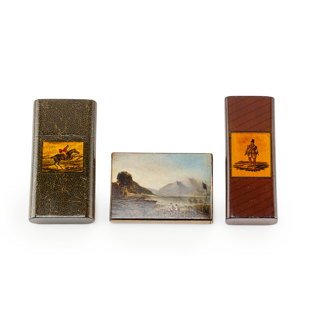 comprising a rectangular cigar case for three cigars, with crosshatch pattern and painted detail of a falconer, indistinct maker's stamp SAMSON & CO.,/ CUMNOCK, 12.5cm long; a case for four cigars, with green pattern, and painted detail of a huntsman, indistinctly stamped maker's mark G. SLIMAN/ CATRINE, 12.5cm long; a calling card box, with painted front panel of a lochside scene with figures, 10cm long (3)