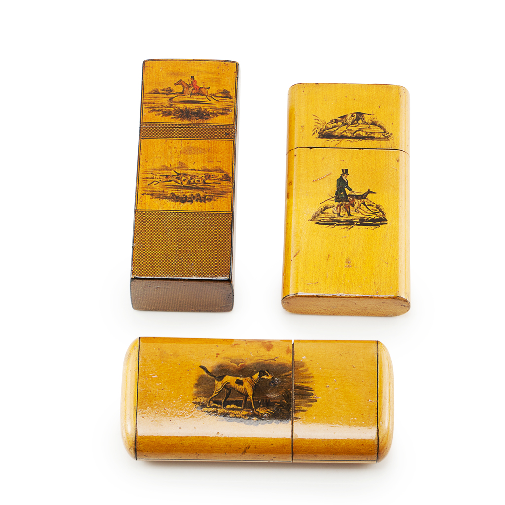comprising a rectangular section box, decorated with penwork panels depicting huntsman and hound, stamped maker's mark DRUMMOND/ CUMNOCK, 12.7cm high; another box of rounded section painted with a huntsman and hounds, 12.2cm long; and another painted with a hound in a landscape, 13cm long (3)