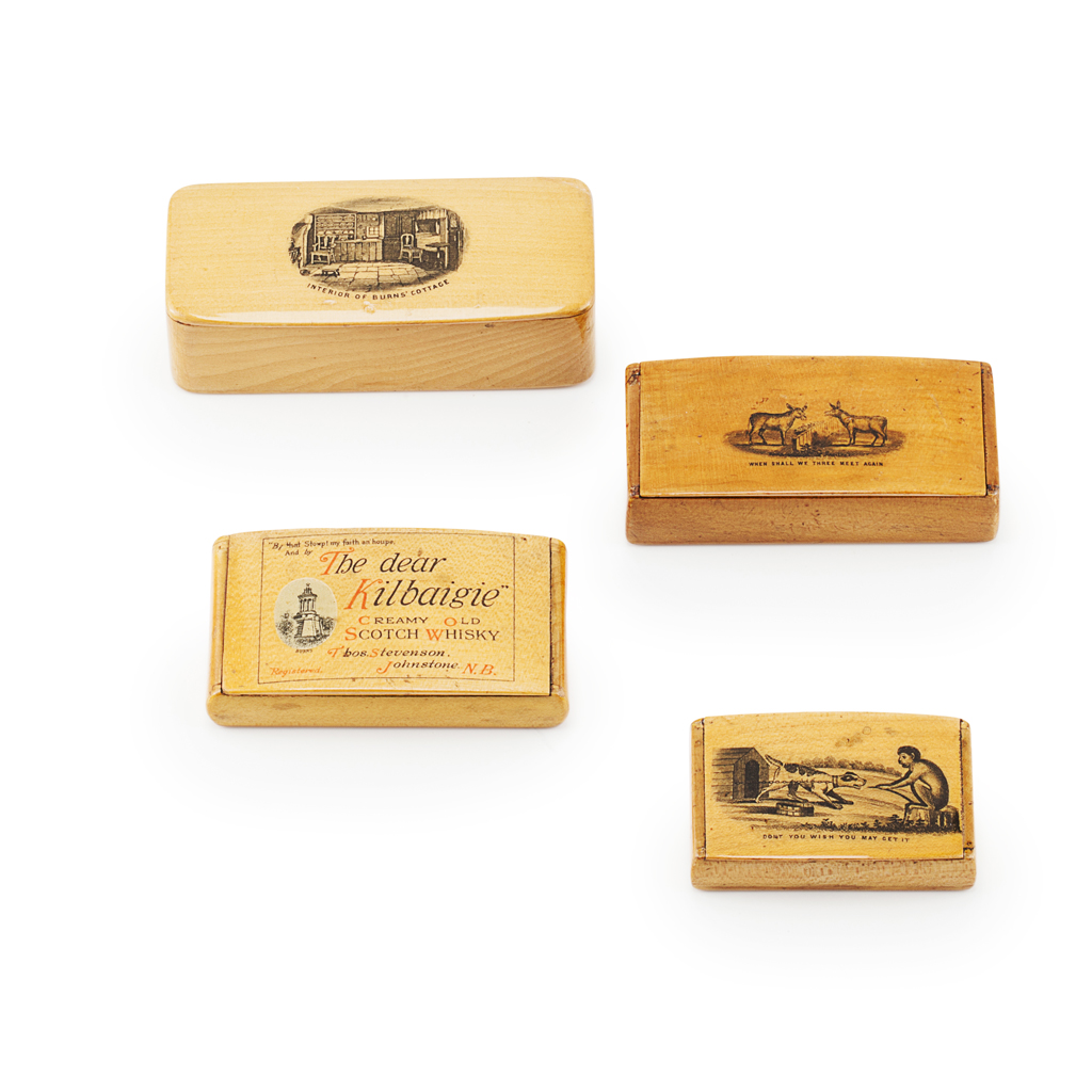 comprising a box with an advertisement for 'THE DEAR KILBAIGIE' whisky, and a transfer image of the Burns' Monument, 8.5cm; a box with a transfer image of a monkey teasing a dog bearing inscription DONT YOU WISH YOU MAY GET IT, bears maker's mark ADOLPH FRANKAU & CO, 6.5cm long; a box with transfer picture of the 'Interior of Burns' Cottage' on the lid, and another transfer image of the cottage exterior on the base, bears maker's mark SMITH/ MAUCHLINE/ MANUFACTURERS, 10.5cm; a box with a transfer print of two donkeys, bears maker's mark ADOLPH FRANKAU & CO, 9cm (4)
