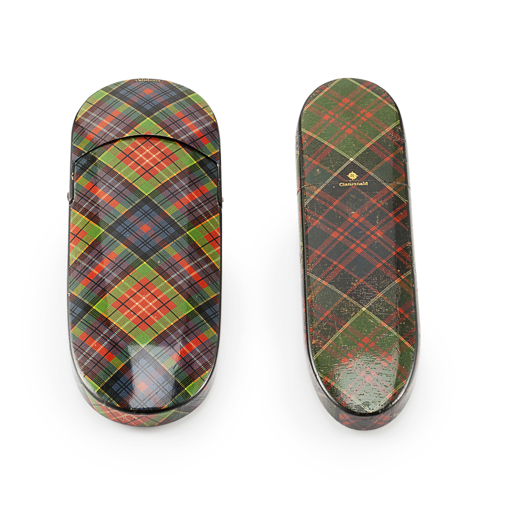 comprising a spectacle case, in Caledonia tartan, and containing a pair of spectacles, 13cm long; another spectacle case, in Clanranald tartan, 13cm long (2)