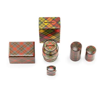 comprising a cylindrical Smelling Salts box in McPherson tartan, containing a glass bottle and bearing inscription SMELLING SALTS, 8cm high; another cylindrical box in Stuart tartan, 5.5cm high; a rectangular money box in Chisholm tartan, 5.95cm wide; another rectangular money box in Buchanan tartan, 10cm high; a ring box in McDuff tartan, 4cm high; and a barrel-shaped moneybox in McLean tartan, 8cm high (6)