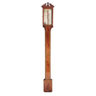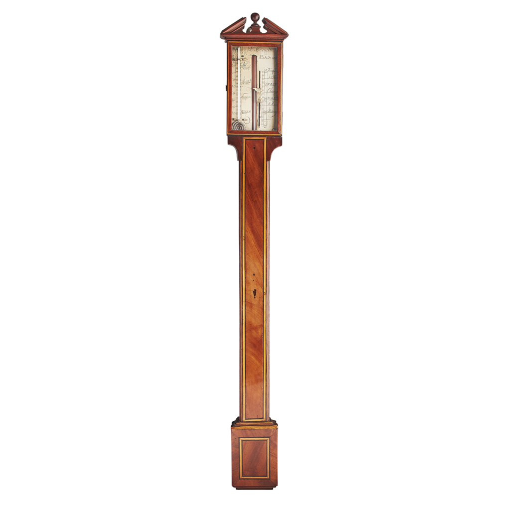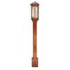 the broken arch pediment centred by a ball finial, above a silvered scale and vernier engraved with temperature and pressure gauges, signed 'L COMITTI / BANFF', within a mahogany case outlined with boxwood stringing and ending in a squared cistern, mercury filled